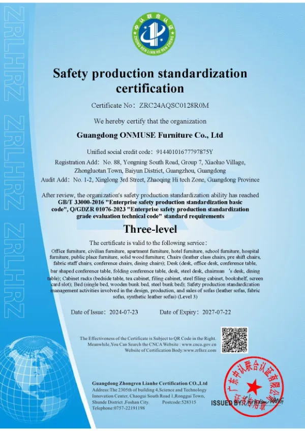 1998 में बैयुन जिले, गुआंगज़ौ, चीन में स्थापित, ONMUSE पिछले दो दशकों में गुआंगज़ौ और झाओकिंग में स्थित दोहरे औद्योगिक पार्कों के साथ एक व्यापक समूह में विकसित हुआ है। 180 म्यू भूमि में 120,000 वर्ग मीटर के कुल क्षेत्रफल को कवर करते हुए, कंपनी अधिक से अधिक लोगों को रोजगार देती है 700 कर्मचारी. ONMUSE अपनी स्वयं की अत्यधिक डिजिटलीकृत उत्पादन कार्यशालाएँ संचालित करता है, जिसमें ठोस लकड़ी के लाह, पैनल फर्नीचर, असबाबवाला बैठने की जगह, कार्यालय कुर्सियाँ और धातु घटकों की सुविधाएं शामिल हैं।
