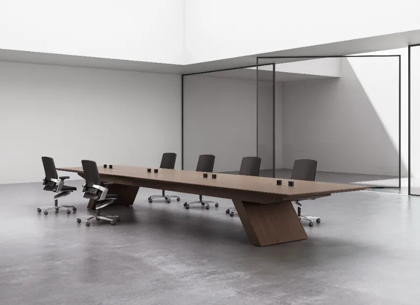 अभिनव पैर संरचना - विशिष्ट वी-आकार के कोण वाले पैर 8 मीटर तक लंबे टेबलटॉप का समर्थन करते हैं। बेवेल्ड कट्स और कैंटिलीवर डिज़ाइन का संयोजन पारंपरिक सीमाओं को तोड़ता है, जिससे आधुनिकता और वास्तुशिल्प उपस्थिति की एक मजबूत भावना जुड़ती है।
